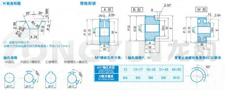 规格 | 形状 | 节径P.D | 外径O.D | 挡边外径F | 挡边内径M | 透孔外径E | 轮毂直径Dm | 内孔dH7 | |||||