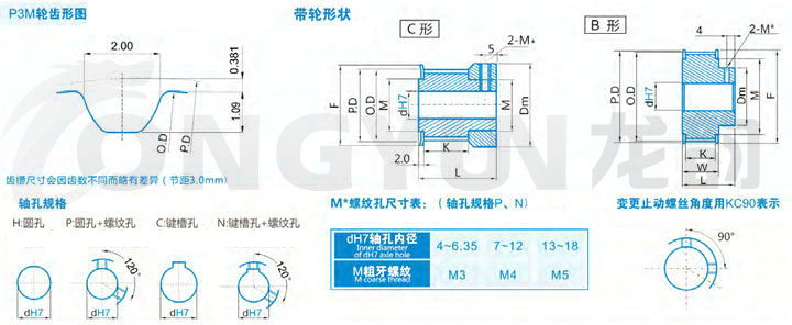 | 规格 | 形状 | 节径P.D | 外径O.D | 挡边外径F | 挡边内径M | 轮毂直径Dm | 内孔dH7 | ||||
