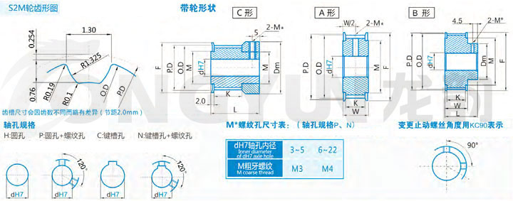 规格 | 形状 | 节径P.D | 外径O.D | 挡边外径F | 挡边内径M | 轮毂直径Dm | 内孔dH7 | |||||